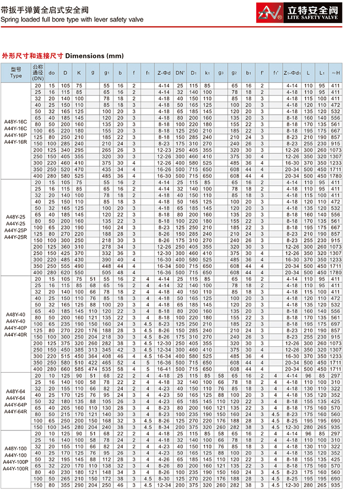 带扳手弹簧全启式安全阀适用于工作温度≤350℃的蒸汽,空气等介质的设备和管路上。A44Y带扳手弹簧全启式安全阀适用于工作温度≤300℃的空气,石油等介质的设备或管路上,作为超压保护装置。连接法兰标准PN<6.4MPa按JB/T-94系列1。PN≥6.4MPa按JB/T-94系列2标准。