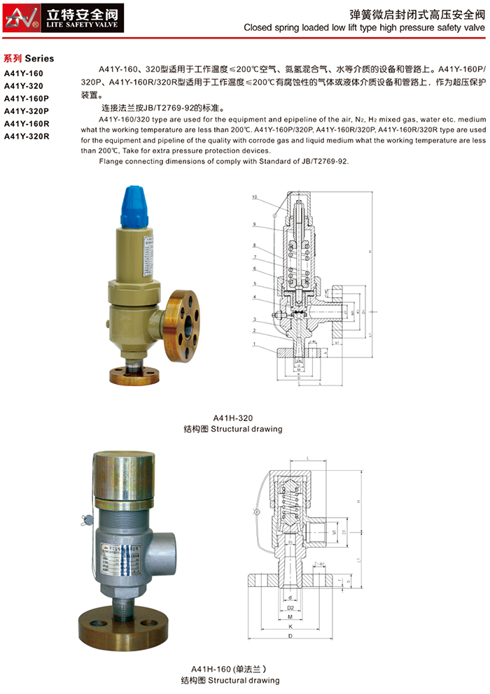 弹簧微启封闭式高压安全阀(单法兰)适用于工作温度≤300℃的空气、氨氢混合气、水等介质的设备和管路上。A41Y-160P/320P、A41Y-160R、320R型弹簧微启封闭式高压安全阀(双法兰)适于工作温度≤200℃有腐蚀性的气体或液体介质的设备和管路上,作为超压保护装置。A41Y-160/320型弹簧微启封闭式高压安全阀连接法兰按JB/T2769-92的标准
