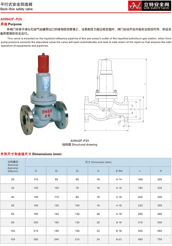 安装于液化石油气站罐泵出口的液相回流管道上,当泵前压力超过规定值时,阀门自动开启并起安全回流作用,保证设备和管路的安全运行。